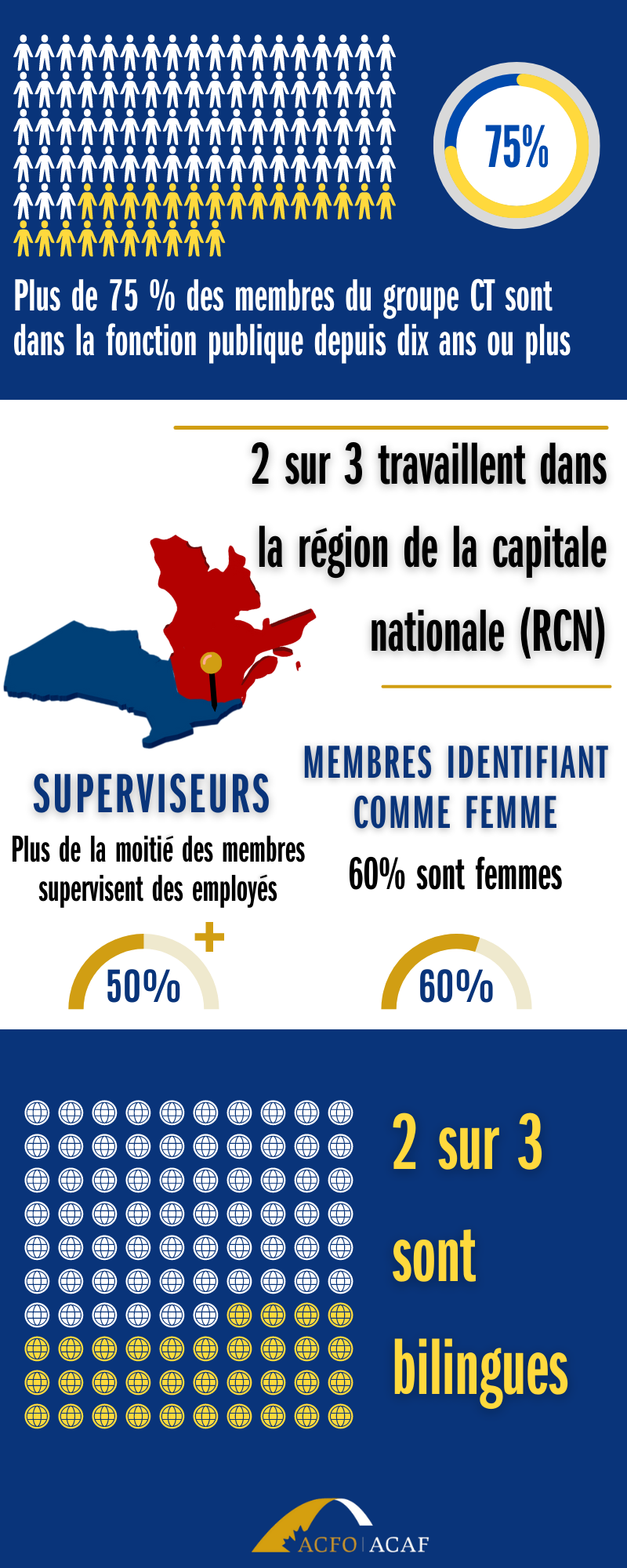 Alors que les membres de la classification CT-FIN (anciennement FI) de la fonction publique sont représentés par l’ACFO-ACAF depuis 1989, quelque 500 auditeurs internes et externes de la fonction publique fédérale sont devenus, en 2019, membres de l’ACFO-ACAF, lors de la création du nouveau groupe professionnel, le groupe CT (Fonction de contrôleur). Quant à nos membres de NAV Canada, ils sont devenus membres de l’ACFO-ACAF, régis par une convention collective distincte, en 1996, lorsqu’ils se sont séparés de la fonction publique fédérale.