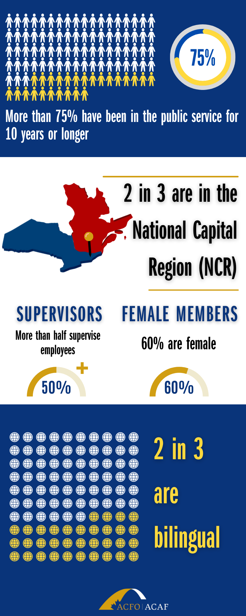 Our public service members work across Canada in more than 70 departments and agencies in more than 700 locations. The vast majority of our approximately 30 NAV Canada members work in Ottawa. Many hold business degrees and/or professional designations such as CPAs, CIAs and CFEs.